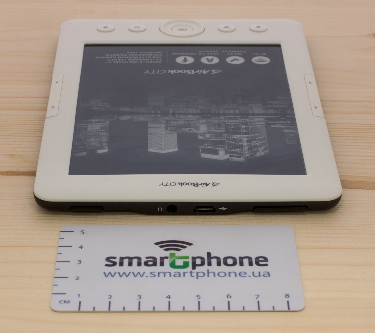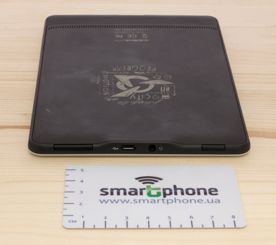 На верхней боковой грани устройства имеются индикатор громкости, разъем micro-USB для передачи данных и зарядки батареи, разъем 3.5 мм для наушников и кнопка питания. Длительное удерживание последний позволит полностью отключить питание ридера, а короткое переведет его в режим сна.