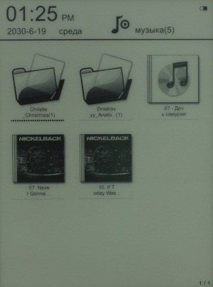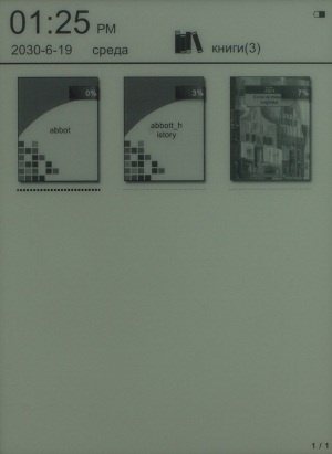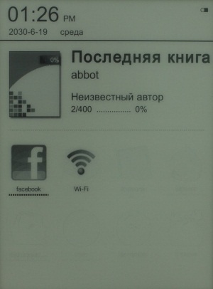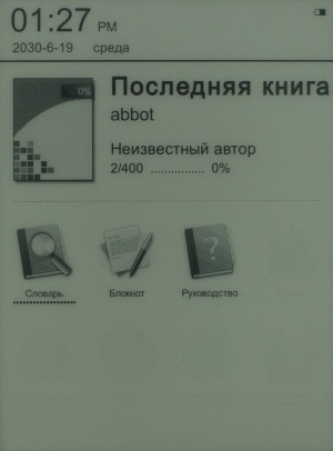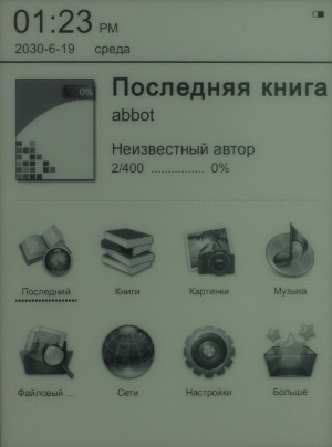 В служебной строке вверху Главного окна ридера слева отображается текущие время и дата, а справа индикатор уровня заряда батареи и сигнала Wi-Fi. В верхней части Главного Меню можно увидеть последнюю, открываемую книгу. А еще ниже находится Панель инструментов, с помощью которой можно перейти к разделам «Последний», «Книги», «Картинки», «Музыка», «Файлы», «Сети», «Настройки» и «Больше».