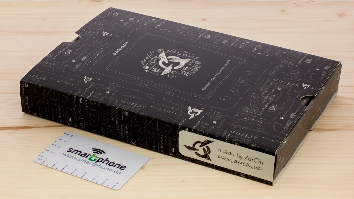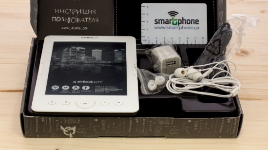 Такой комплектацией как у AirBook City не может похвастаться, пожалуй, ни один, даже самый известный производитель электронных книг. Ридер от компании AirOn поставляется в картонной коробке черного цвета.