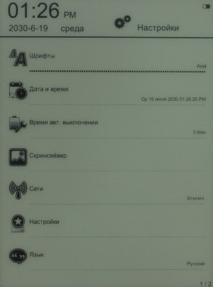 В «Настройках» можно изменить шрифт, язык интерфейса устройства, установить текущее время и дату, время автоматического выключения ридера, доступен диапазон от 3 до 30 минут, а также вариант «Никогда», выбрать заставку, выбрать точку подключения, просмотреть информацию о ридере и инструкцию к нему.