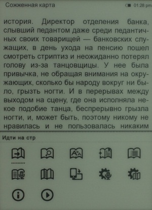В процессе чтения пользователю доступны такие функции как поиск по тексту, переход на определенную страницу, изменение параметров отображаемого текста. Так пользователь может выбрать с 8 размеров шрифта и 5 его стилей, тот, который ему подойдёт наиболее. Также можно подобрать подходящий вариант межстрочного расстояния и ширину полей. Здесь же можно воспользоваться функцией перехода к содержанию книги, добавлению закладки и переходу от книжного отображения к альбомному.