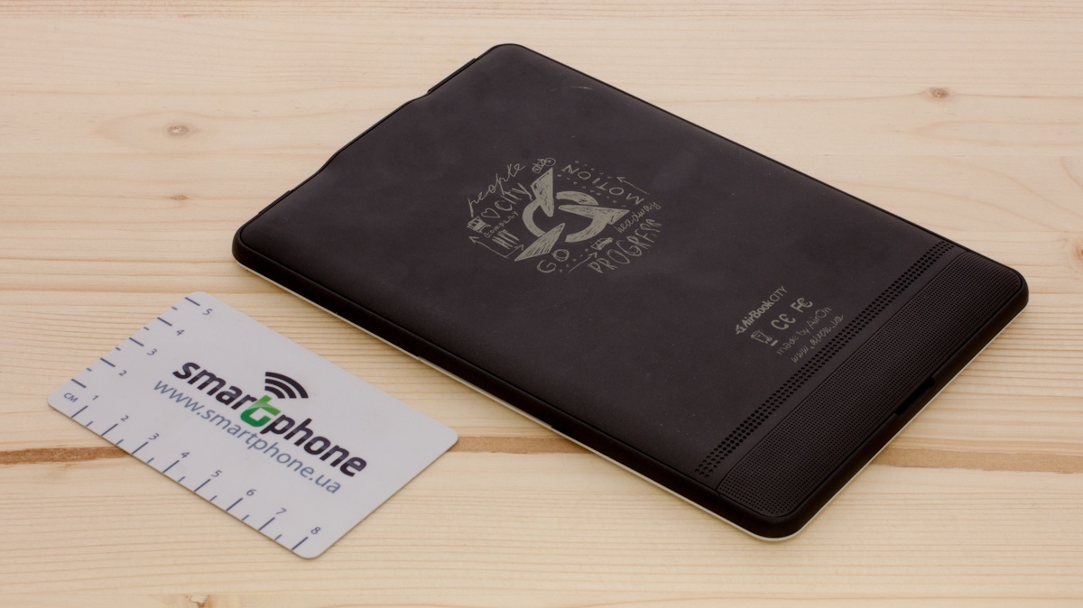 Корпус ридера выполнен из матового пластика. На лицевой стороне он белый гладкий с надписью AirBook City вверху, а вот задняя поверхность устройства покрыта прорезиненным пластиком черного цвета. Здесь по центру нанесен абстрактный рисунок, а немножко ниже указаны название устройства, фирмы производителя и ее официальный сайт.