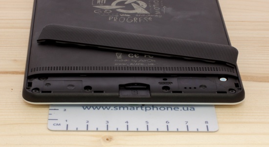 На нижней боковой грани присутствует углубление для открытия крышки, находящейся внизу задней панели устройства сразу же под динамиками. Под ней находится слот для карт памяти и кнопка перезагрузки.