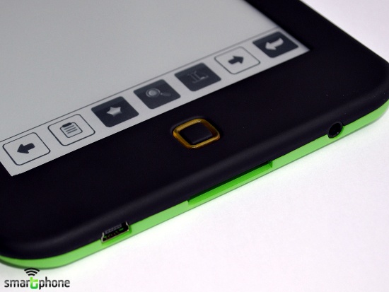 На тыльной панели ридера расположена кнопка reset, а также несколько строчек технической информации о новинке. ![]() На левой боковой панели имеется кнопка регулирования громкости устройства, а на нижнем находится порт mini-USB и слот для карт памяти SD и разъем 3,5 мм. На других панелях функциональных элементов не предусмотрено. ![]() Краткие технические характеристики