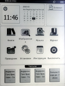 «На борту» ридера процессор Samsung S3C2416 (ARM9 Core), 400 МГц, а также 64 МБ оперативной памяти. МенюМеню ImBook 0411 реализовано в виде трех больших разделов, которые расположены между собой в формате некой лесенки. ![]() Первый раздел, представлен приложениями «Календарь», «Часы», а также «Блокнот». ![]()