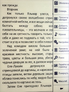 Во время чтения, пользователь может вызвать некоего плана контекстное меню, в котором есть, например словарь – пригодится, если читаешь книги, например, на английском языке, и попалось непонятное слово. Отсюда же пользователь может перейти в подменю «Музыка», посмотреть содержание книги и многое другое. ![]() Что же касается самого проигрывателя, пожалуй, кроме поддержки нескольких редких для такого приложения форматов, ничем другим «похвалиться» он не способен. ![]()