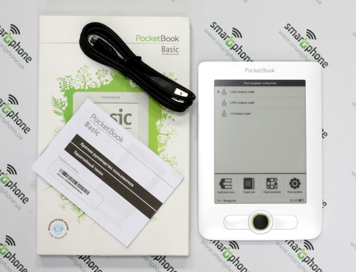 Ну а теперь о комплектации — в компактной картонной упаковке, помимо самого устройства, мы нашли кабель для соединения с компьютером и небольшую инструкцию. Как и при покупке большинства других ридеров, вы не найдете в комплекте с Pocketbook 613 чехла. Хочу заметить, что он таки пригодится, поскольку ридер идет без крышки, и необходимо будет защитить экран от внешних повреждений.