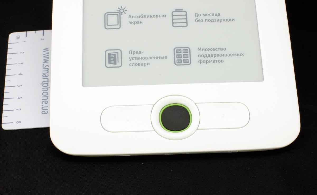 Внизу на передней панели устройства находится пятипозиционный джойстик управления и две клавиши перелистывания страниц. Стоит отметить, что эти клавиши обустроены очень удобно, и без проблем можно перелистывать страницы той же рукой, в которой находится книга.