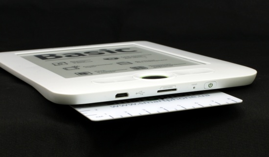 В Pocketbook 613 имеются два разъема: USB и слот для карт MicroSD. Как и во всех предыдущих моделях ридеров Pocketbook, разъемы и кнопки размещены на нижней панели устройства. Кнопка включения/выключения в этой модели оснащена светодиодным индикатором работы, который в настройках можно в любой момент отключить.