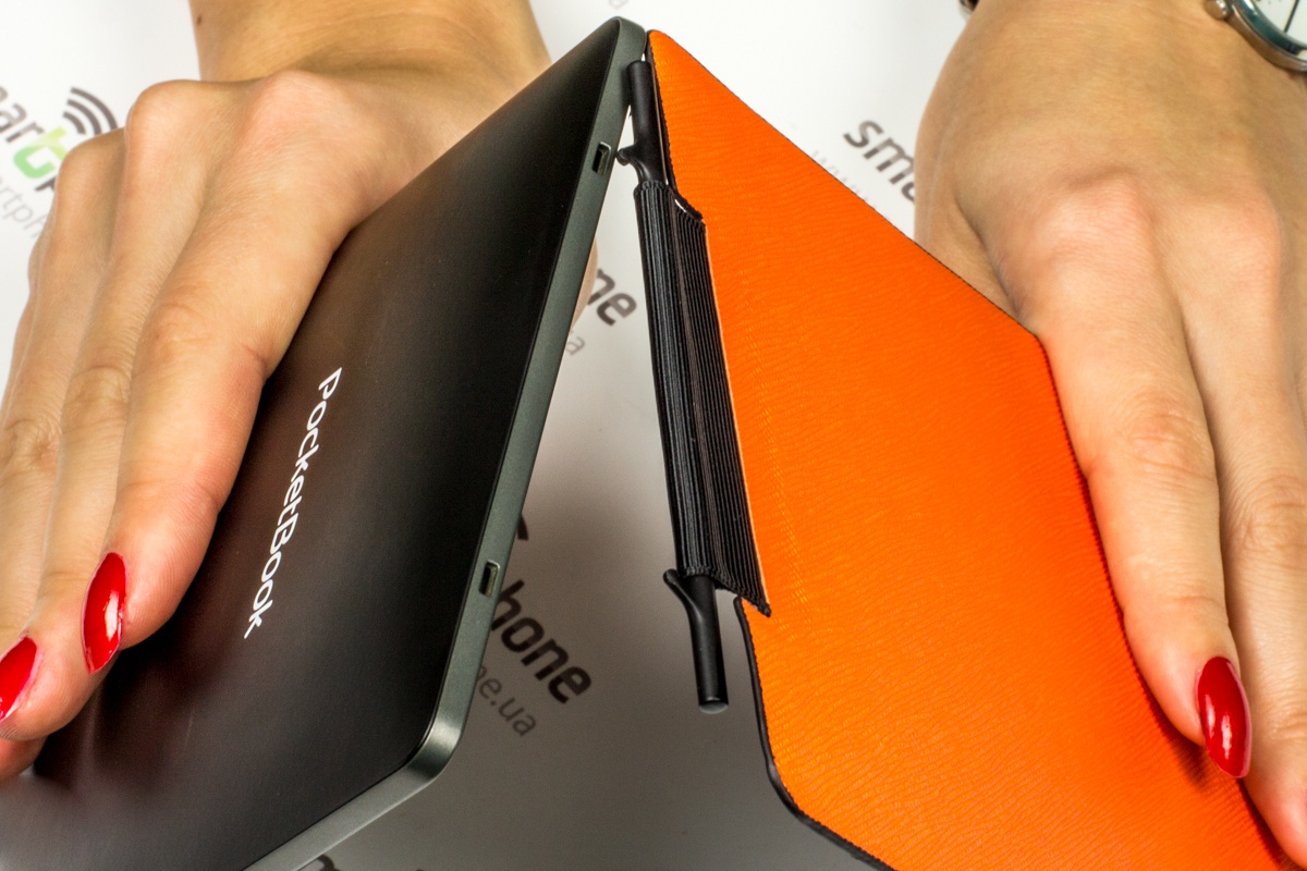Из новенького также отмечу появление на верхней грани специальных разъемов для крепления чехла-обложки, о котором я уже упоминала выше. Ранее аналогичное решение можно было видеть в карманном PocketBook mini.