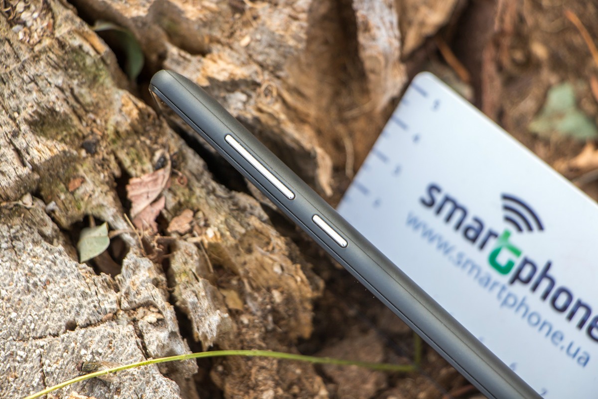 Дизайн трубки выполнен в стиле строгого минимализма. Материалы подобраны хорошо. У нашего черного тестового образца тыльная крышка из софт-тач пластика. Отпечатки и разводы на ней не собираются, в руке смартфон держать приятно.