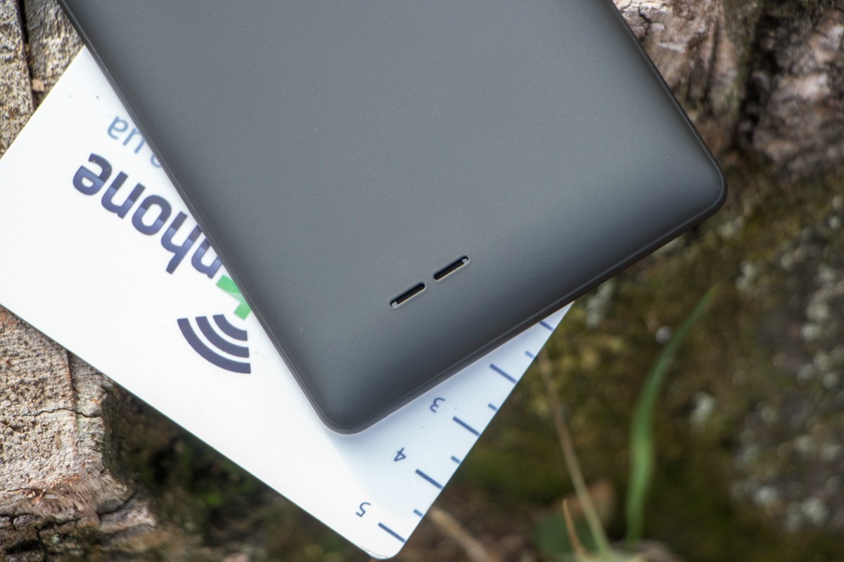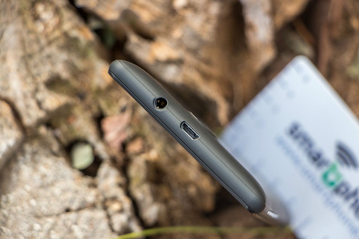 Расположение разъемов и кнопок следующее: справа - кнопка питания и клавиша управления громкостью, внизу - микрофон и зазор для снятия крышки аккумуляторного блока, а вверху - 3,5 мм аудиоразъем и microUSB порт.