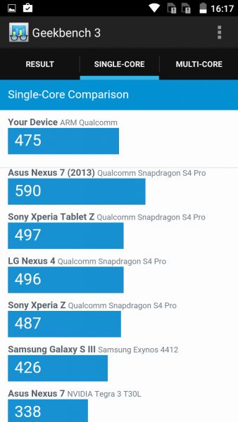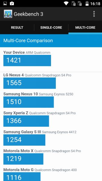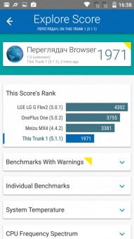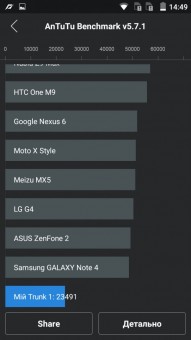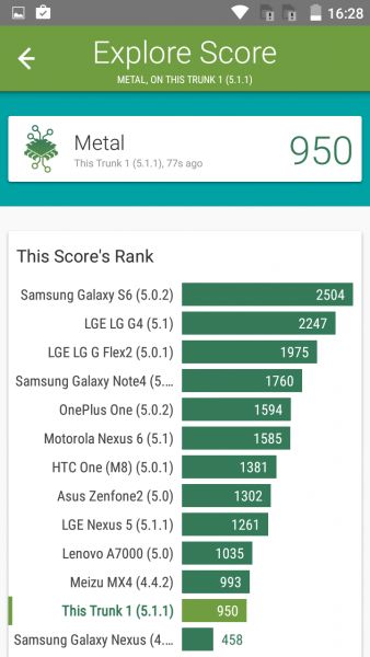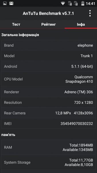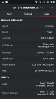 За основу аппаратной платформы Elephone Trunk взят 64-битный процессор Qualcomm Snapdragon 410 (MSM 8916) с частотой 1,2 ГГц и графическим чипом Adreno 306. При этом оперативной памяти в устройстве 2 ГБ, так что и видео в высоком разрешении, и игры из списка лучших 3D-симуляторов и аркад будут запускаться и работать без тормозов. Хотя, возможно, и не на максимуме графических настроек. Ниже результаты прогона этой трубки по бенчмаркам. Учитывая стоимость в 120 долларов показатели достойные.