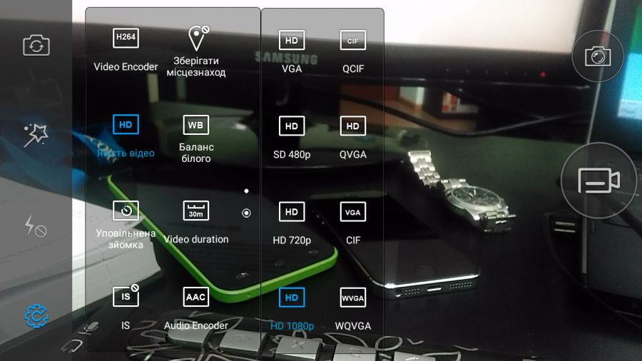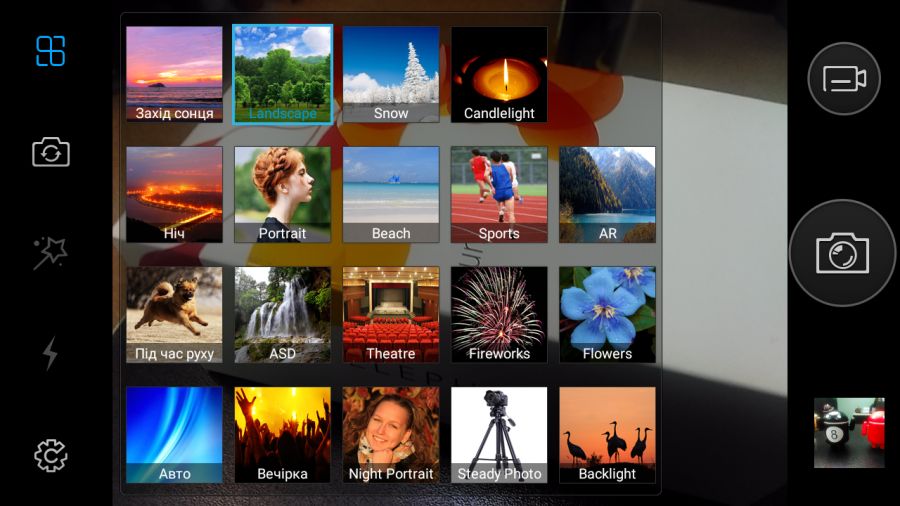 Основная камера в смартфоне производства Samsung с модулем на 13 МПикс, хотя реальное количество мегапикселей все-таки 8. Конечно же, есть автофокус, предустановленные режимы съемки, широкие настройки основных параметров и разрешения. Отдельно отмечу удобство организации работы с выбором настроек.