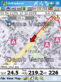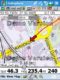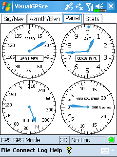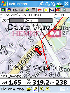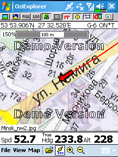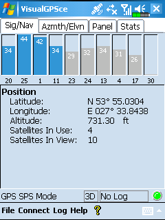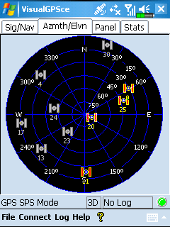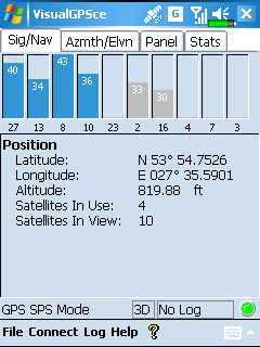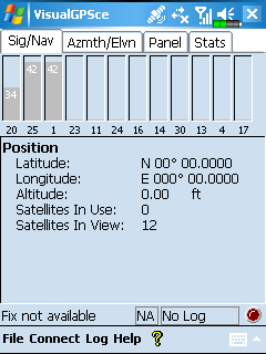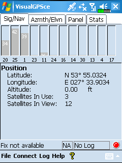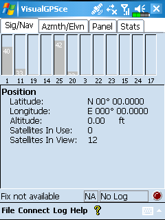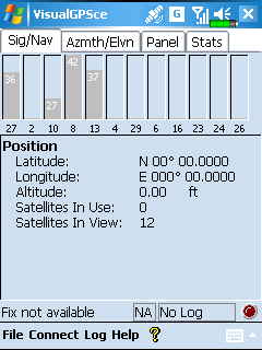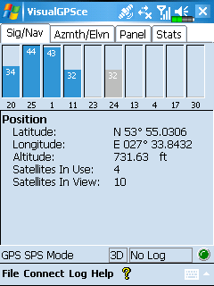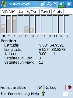 Иногда он, правда, одумывается и прекращает броуновское движение, но ненадолго. Если отойти от окна на 3 метра, то сигнал теряется. Но, не в помещении же нам, в конце концов, дорогу искать. Сядем-ка лучше в машину и посмотрим, как поведет себя наш герой, оказавшись в своей тарелке. При этом мы решили искать спутники прямо из движущейся машины. То, как происходит "зацепка" за спутники, снова лучше всего увидеть с помощью VisualGPSCe, поэтому просто посмотрим на скриншоты. Напоминаем, что уровень сигнала от пойманных спутников отображается в виде вертикального серого столбца. Когда устанавливается режим навигации, то столбцы используемых спутников меняют свой цвет на синий.