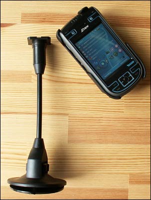 Кредл для крепления коммуникатора на стекле автомобиля можно только похвалить. Изготовлен он, как водится, из прочного пластика.