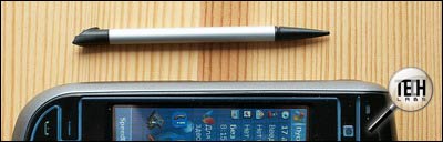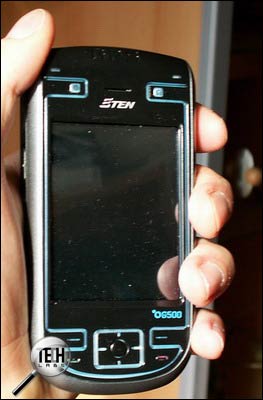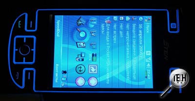 Если раньше, и то не всегда, подсвечивали только управляющие клавиши, то теперь вокруг всего экрана проходит ярко-голубая светодиодная подсветка. Она захватывает кнопки и причудливыми изгибами повторяет контуры корпуса. В темноте это великолепие выглядит просто потрясающе. Браво дизайнерам ETEN! Отличное свежее решение. Но, вдоволь налюбовавшись этими красотами, продолжаем досмотр дальше. Управляющие элементы очень напоминают таковые у QTEC 9100. Вот только их конструктивное исполнение немного необычно и полностью подчинено дизайну. Над поверхностью лицевой части выступает только многопозиционный джойстик с кнопкой подтверждения в центре. Форма его напоминает аналогичный элемент у наладонников Fujitsu Siemens. За счет этого ошибочные нажатия исключены. Кнопки же выполнены заподлицо с корпусом, что, в общем-то, не мешает их использованию. Правда, нужно пару часов, чтобы привыкнуть.