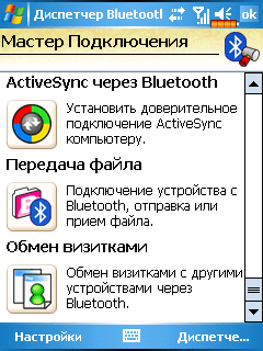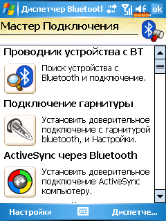 К интересным особенностям регулировки подсветки можно отнести наличие двух опций. "Autoadjust by battery’s cap" – изменение подсветки в зависимости от уровня заряда батареи, "Autoadjust backlight by idle time" - плавное уменьшение подсветки до минимального уровня (но не выключение) по мере бездействия КПК. Коммуникационные возможностиПо наличию беспроводных интерфейсов связи аппарат мог бы безоговорочно лидировать, будь у него на борту еще и модуль Wi-Fi. Тогда это был бы тот самый универсальный комбайн, о котором только можно мечтать. Но чего нет, того нет. Те, кто жизнь свою без него не представляют, возьмут ETEN M600. Ну, а счастливые же обладатели ETEN G500, несомненно, оценят GPG-модуль. Но о нем мы поговорим чуть позже, а пока вернемся к беспроводным интерфейсам, присутствующим в данном девайсе. Включить или же, наоборот, выключить, а так же перейти к настройкам того или иного интерфейса беспроводной связи (а их здесь всего два) можно с помощью утилиты Wireless Manager. BluetoothАппарат оснащен Bluetooth стеком версии 1.2. О новомодном Bluetooth 2.0 говорить пока не приходится. К недостатку реализации интерфейса следует отнести встроенные в операционную систему драйвера от Microsoft, поскольку функциональностью они не блещут. Управление интерфейсом осуществляется при помощи утилиты Connection Wizard, которая здорово упрощает эту процедуру. Что же касается служб, предоставляемых коммуникатором, то возможны лишь следующие соединения.