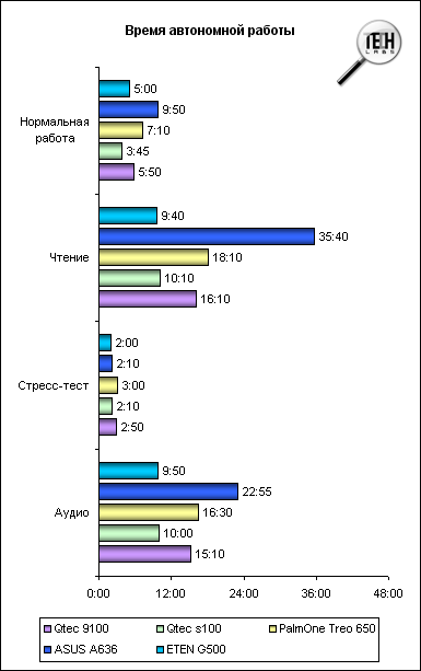 Например, при съемке в помещении, освещаемом люминесцентными лампами, при установке баланса на аналогичное значение, все цвета вдруг приобретали резкий зеленый оттенок. И, что характерно, аналогичная картина наблюдалась со всеми другими вариантами. Так что, единственным спасением остается съемка на автомате. Сделанный снимок можно сразу же удалить, изменить во встроенном редакторе, послать по электронной почте либо как MMS сообщение. Впрочем, о том, что можно будет сделать с полученными фотографиями, мы поговорим попозже, а сейчас предлагаем узнать, как же поведет себя наш герой с точки зрения времени автономной работы. Время автономной работыКак упоминалось выше, ETEN g500 питается от съемного литий-ионного аккумулятора емкостью 1440 мАч. Производитель уверяет нас, что полного заряда должно хватить на 200 часов (чуть больше 8-ми дней) в режиме ожидания и на 3.5-4 часа в режиме разговоров. Аналогичные показатели, если вы помните, были и у QTEC 9100. Но у него был процессор TI OMAP850 195 MHz и батарея 1250 МАч. У нашего же обозреваемого гораздо более мощный процессор, зато и емкость батареи повыше. Теоретически, результаты тестирования должны быть одинаковы. Посмотрим, как обстоит дело на практике. Итак, в условиях минской сети MTS при средней нагрузке (25 минут разговоров в день, два часа работы в день с другими функциями, включая GPRS, и два часа GPS навигации) коммуникатор проработал полтора дня. Исключив из списка GPS, мы тем самым увеличим время работы до двух дней. Если же к этому добавить еще прослушивание MP3 по 2-3 часа и 2 часа Интернета, то заряда батареи хватает на сутки. Если же не использовать никакие функции, а разговаривать по 5 минут в день, то зарядное понадобится через 3.5 дня. Вполне достойный результат. Теперь же, как водится, испытаем нашего гостя на выносливость в качестве обычного наладонника по нашей стандартной методике. Результаты представлены в таблице.