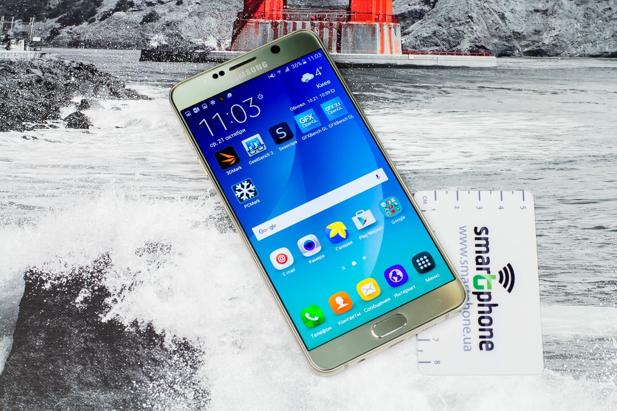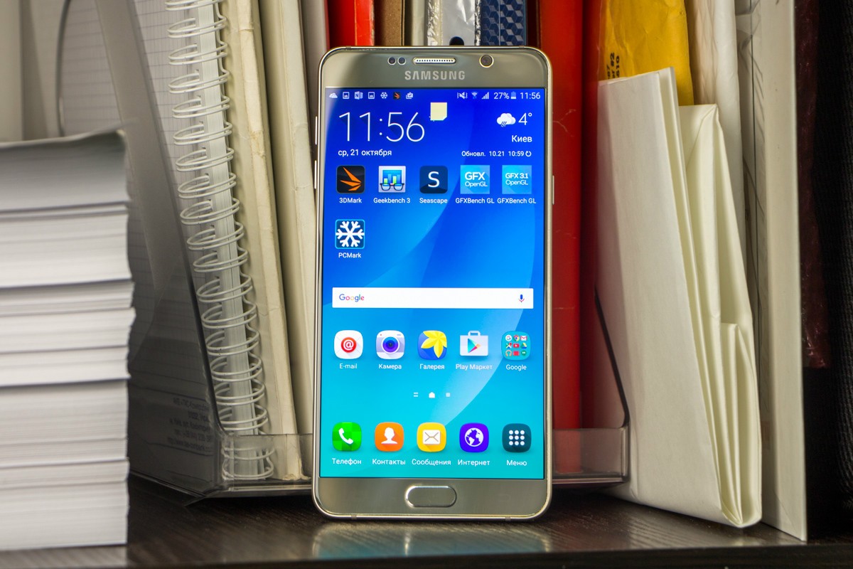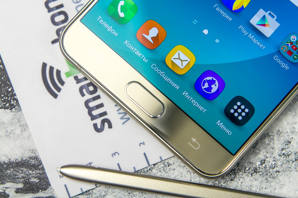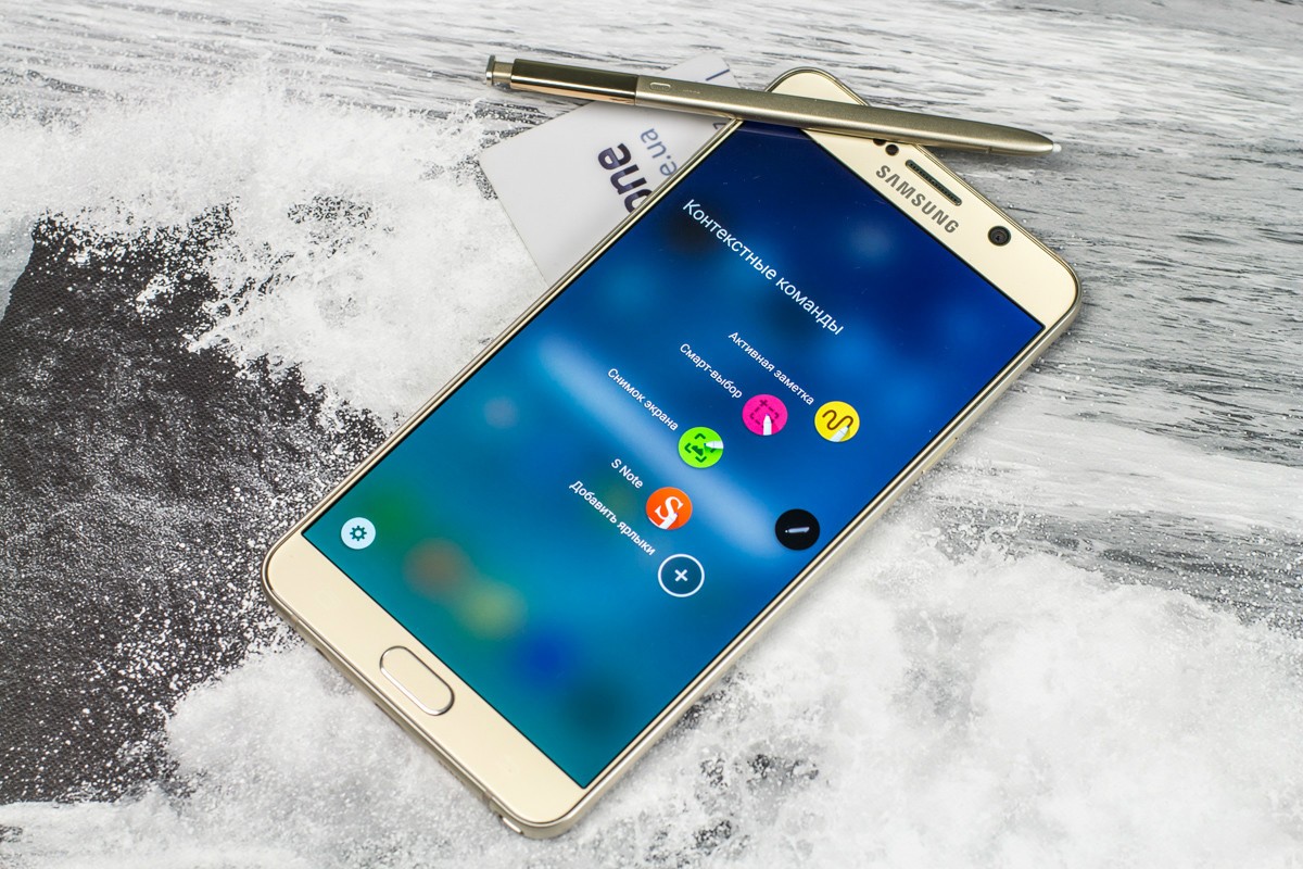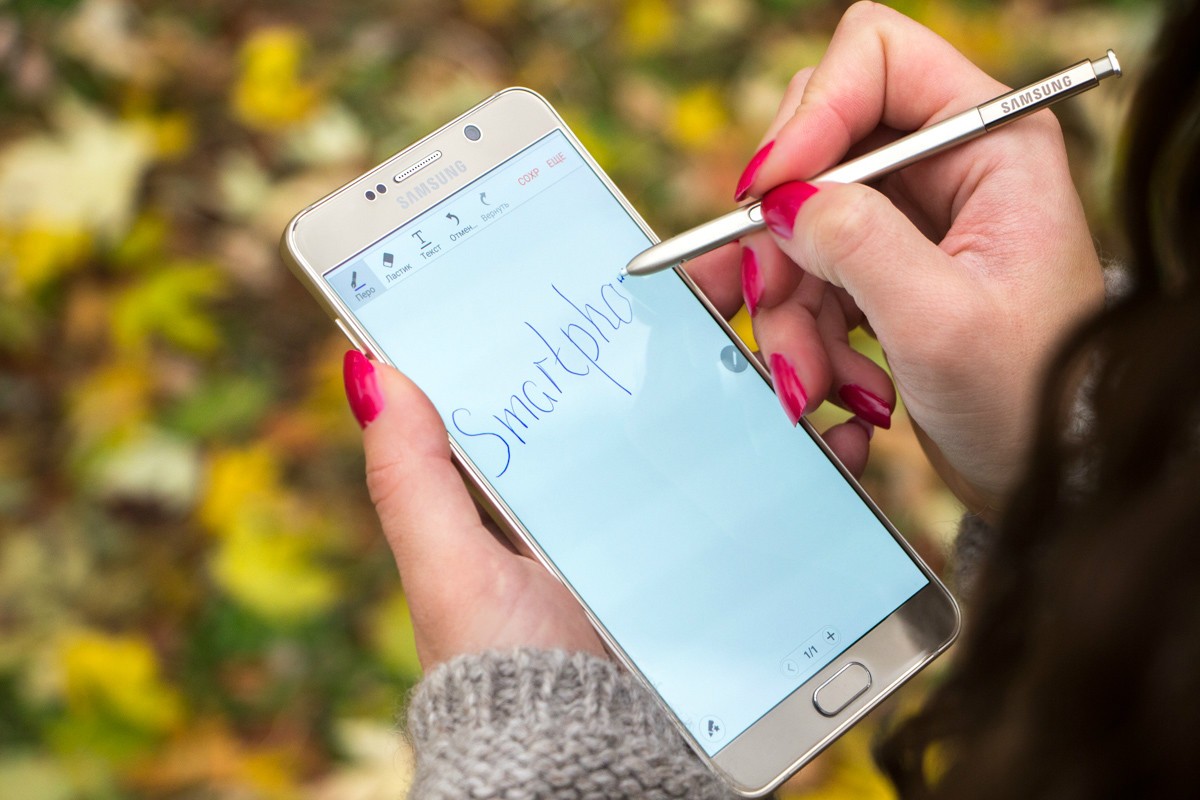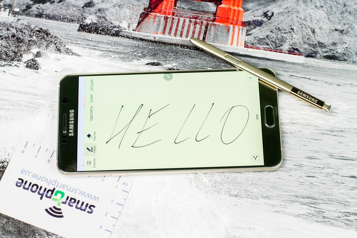 Обзор фаблета Samsung Galaxy Note 5 – флагман со стилусом!Почти сразу же после официального украинского релиза нам удалось протестировать новейший флагман линейки Galaxy Note от Samsung. Для поклонников бренда и потенциальных покупателей главных новостей как минимум три: новый дизайн, усовершенствованное электронное перо S Pen и куда мощнее в сравнении с предшественником «железо». “На бумаге” выглядит более чем многообещающе, да и ценник Note 5 в 19999 грн не дает повода в этом усомниться, тем не менее, детальный обзор Note 5 не помешает. Лень читать текстовый обзор? Смотрите видео-обзор...Дизайн и функциональные элементыGalaxy Note 5 был представлен одновременно с S6 Edge + не просто так. Этих «двух», как оказалось, родит не только похожее «железо» и программная начинка, но и некоторые элементы дизайна. И дело не только в общем фирменном стиле Galaxy-флагманов 2015-го года, предусматривающем сочетание металлической рамки со стеклянными панелями Corning Gorilla Glass 4, но и в одинаковом расположении функциональных элементов. Так, на тыльной панели Note 5 находится выступающий над поверхностью объектив 16Мп камеры с металлическим кантом, логотип компании-производителя, плюс отдельный модуль со светодиодной вспышкой и датчиком сердечного ритма, также обрамленный рамкой из металла. На передней панели фаблета расположен 5.7-дюймовый дисплей, решетка разговорного динамика, объектив 5Мп камеры, LED-индикатор, датчики освещения/приближения, две сенсорные клавиши управления с подсветкой и механическая кнопка «Домой» со встроенным сканером отпечатков пальцев. Последний распознает даже мокрые пальцы, может быть использован как для входа в аккаунты Samsung или других веб-сайтов, так и для подтверждения своих покупок на PayPal. На правом торце фаблета обустроена кнопка питания, слева — клавиши регулировки громкости, сверху — слот для nanoSIM-карты и микрофон шумоподавления, а снизу — 3.5 мм аудиовыход, порт microUSB, микрофон и решетка мультимедийного динамика. Здесь же в нижнем правом углу находится одна из главных отличительных особенностей данной модели, - отсек для стилуса S-Pen четвертого поколения. Однако детально о нем и его возможностях я расскажу чуть ниже. Возвращаясь к дизайну, отмечу, что S6 Edge + и Note 5 похожи, но не идентичны еще и потому, что у первого загнута по бокам передняя панель, а у второго тыльная. Благодаря этому, кстати, несмотря на большой экран и габариты 153.2x76.1x7.6 мм при весе 171 грамм, Note 5 удобно лежит в ладони. А вот дотянуться пальцами одной руки до всех элементов управления на его корпусе и иконок на экране из-за таких размеров сложновато. Отчасти ситуацию спасает наличие программных режимов «Управления одной рукой» и «Простой экран». Качество сборки Note 5 отличное - нет зазоров между деталями и ничего не люфтит. Девайс доступен лишь в двух цветах – золотом, как у нас на тесте, и черном. Можем предположить, что гаджет в темном не менее маркий, чем наш светлый образец, а потому будет требовать частой протирки. СтилусНу а теперь самое время брать в руки карандаш. А стилусу S-Pen нового поколения ведь и вправду есть, чем похвастаться. Перо распознает 2048 степеней нажатия, отслеживает уровень наклона и скорость передвижения, может эмулировать жесты, а рисовать с его помощью можно даже на выключенном экране. Замечу также, что при заталкивании стилуса обратно в смартфон заметка сохраняется авто