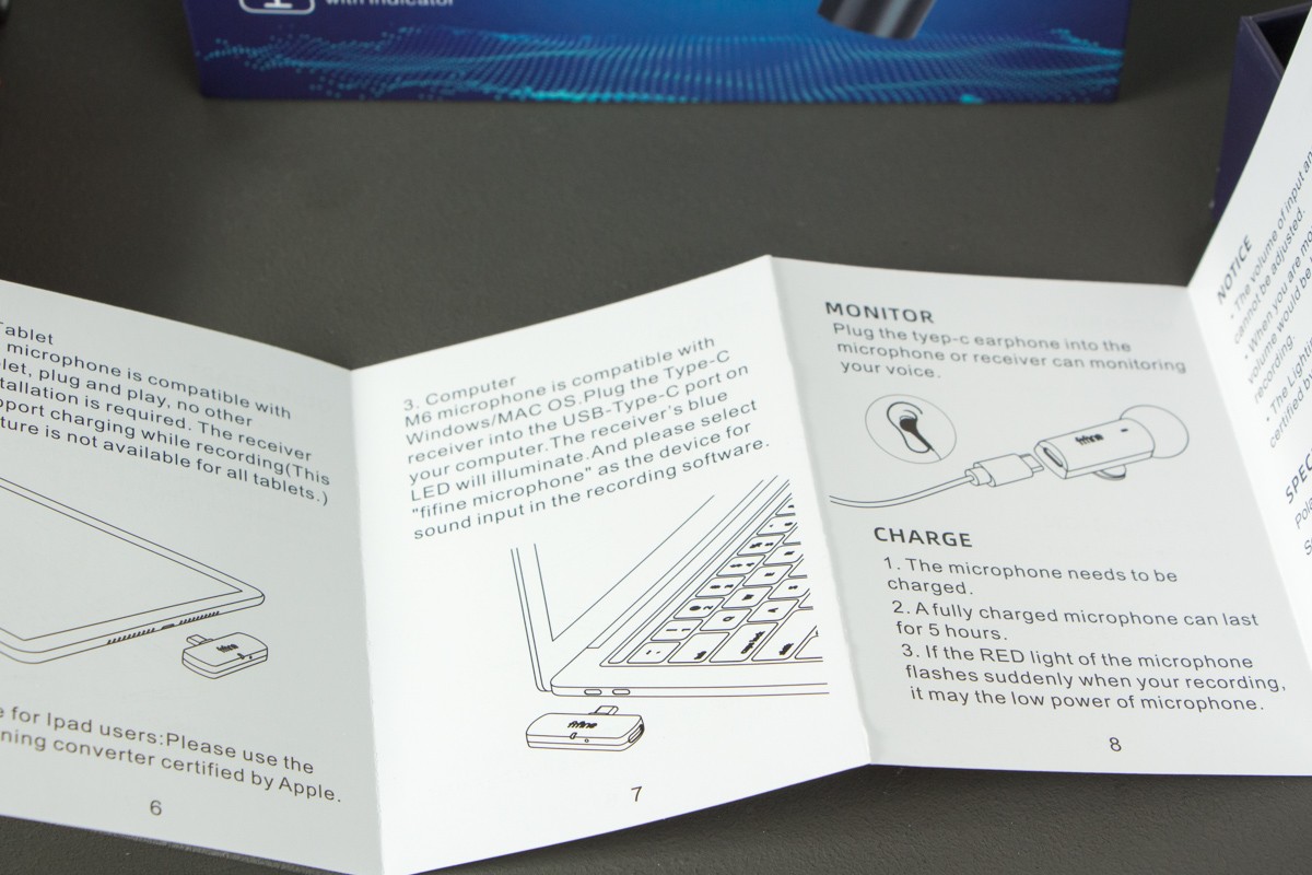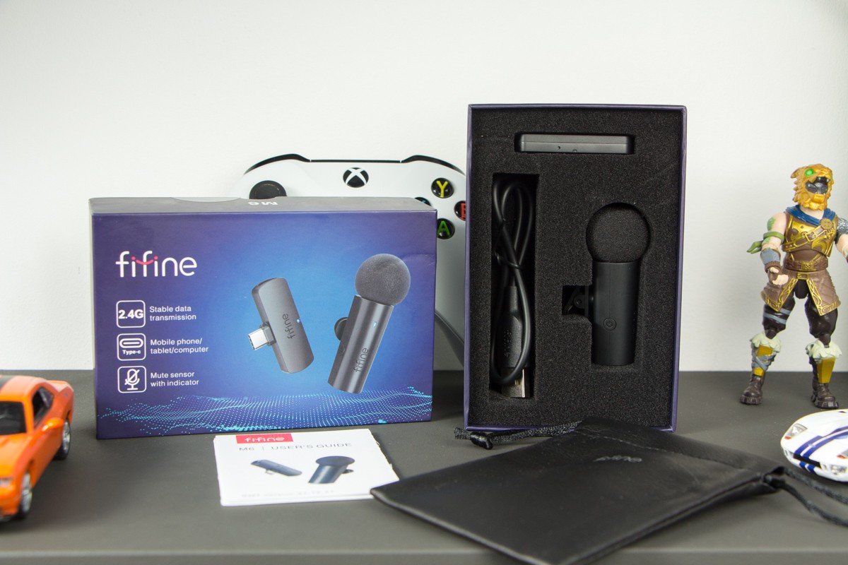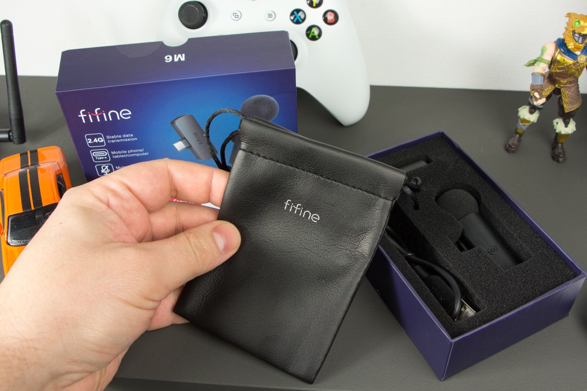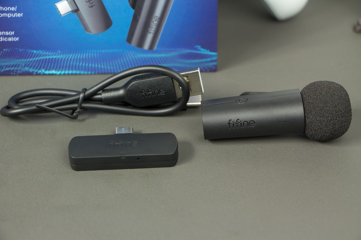 Обзор FIFINE M6: компактный беспроводной микрофон на 2,4 ГГц для смартфонаFIFINE M6 – очень компактный набор из микрофона и приемника, который подключается к смартфону через USB Type-C порт и работает на частоте 2,4 ГГц. Цена на устройство небольшая, батареи должно хватать на 5 часов. В обзоре проверю эти цифры и дам послушать, как в реальности записывает звук FIFINE M6. Комплектация Покупатель получает микрофонную систему в компактной коробке с изображением устройства и визуальным обозначением основных характеристик. Внутри микрофон с прищепкой, приемник, кабель Type-C – USB Type-A длиной 30 см, мягкий чехол из кожзама, а также небольшая инструкция по подключению и использованию. Дизайн и Корпус Внешне FIFINE M6 выглядит просто, но актуально. В корпусе без излишеств, очень понравилось, что дизайнеры не стали делать какие-либо акценты из глянцевого пластика. В корпусе только матовый пластик черного цвета. Ветрозащита предусмотрена, она большая и хорошо дополняет дизайн. Надевается и снимается без большого усилия. Под ней видно решетку, прикрывающую устройство приема звука. Индикатор работы размещен на лицевом торце, тут же еле видимый логотип бренда. Если светодиод горит зеленым – устройство подключено к питанию и уже заряжено, красным – микрофон выключен (MUTE), синим – работает. На правом ребре кнопка включения. Прищепка размещена в удобном месте. Она вращается на 360 градусов. Модуль приемника небольшой, с длинным «хвостом», который позволяет установить его в Type-C порт даже на смартфоны, одетые в чехол. По сборке упрекнуть производителя не в чем. Напоследок отмечу, что модуль микрофона хоть и небольшой, но позволят комфортно записать диалог между несколькими людьми, поочередно поднося его от одного спикера к другому. Возможности Что мне нравится в FIFINE M6 – для работы с ним не нужно никакой предварительной настройки. Нажимаете кнопку на микрофоне и вперед. Ваше дело - сосредоточиться на создании контента. Ко всему прочему система беспроводная, а значит нет никаких проводов и путаницы. Просто не забывайте, когда это нужно, подзаряжать устройство. Обозреваемая пара микрофона и приемника работает в полосе частот 2,4 ГГц. Так что для оптимальной производительности по дальности и качеству записи рекомендуются использование в среде с ограниченным трафиком Wi-Fi 2,4 ГГц и минимальными физическими препятствиями между приемником и микрофоном. По времени автономной работы хотелось бы большего, но и до 5 часов непрерывной записи – чаще всего достаточно. Зарядка микрофона до 100% занимает не более полутора часов. Технические характеристики микрофона fifine M6