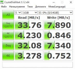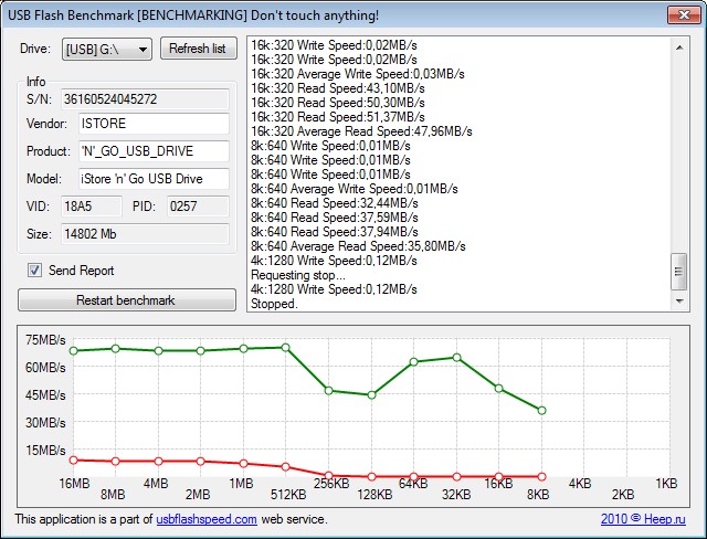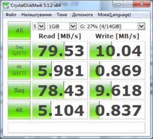 Корпус флеш-накопителя изготовлен из металла, так что не боится падений даже с большой высоты. Кроме того, материал довольно устойчив к трению – недельное ношение флешки на связке с ключами никоим образом не отразилось на ее внешнем виде. Прозрачные колпачки, прикрывающие коннектор Lightning и классический USB-порт, пластиковые, однако за время тестирования убедилась, что и этот материал здесь достаточно прочный. Они очень туго одеваются на корпус и крепко сидят на нем. Таким образом, чтобы их снять или одеть, придется приложить усилий, зато никакого риска потерять. К обустройству самих коннекторов также никаких претензий – они прочно и надежно закреплены. Для безопасного ношения флешки на колпачке со стороны коннектора Lightning предусмотрено ушко со страховочным ремешком, поэтому накопитель можно без проблем повесить, например, на связку ключей. На лицевую часть гаджета темно-серого цвета нанесен логотип компании-производителя. Его емкость в свою очередь указана на порту USB. Причем в таком месте, что даже после появления характерных отметин от взаимодействия разъема с USB портом ноутбука она останется хорошо читаемой. Замечу, что на тестировании у нас побывала 16 ГБ версия устройства, в сущности, линейка Verbatim Store'n'Go USB 3.0 Drive Lightning состоит из трех модификаций – 16 ГБ, 32 ГБ и 64 ГБ. Тестирование скоростейДля тестирования флешки был использован следующий тестовый стенд: Программа CrystalDiskMark оценила скорость последовательного чтения в 79 Мб/с при подключении к USB 3.0, что в 2 раза быстрее, чем при использовании интерфейса 2.0. Скорость последовательной записи в утилите была оценена в 10 Мб/с при подключении к порту USB 3.0 против 7.89 Мб/с при использовании порта 2.0.