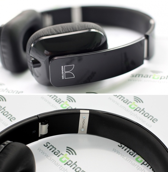 Упаковка и комплект поставкиУстройство помещено в большую коробку, которая сразу привлекает к себе внимание. Внутри картонного бокса расположена еще одна небольшая картонная коробка с кабелями, инструкцией и сумкой для транспортировки. Размеры последней 15х15 см, и сделана она из прочного, но гибкого материала, схожего на прорезиненный пластик. Именно в нем и хранятся наушники в сложенном состоянии. На одной из внутренних стенок бокса/сумки дополнительно сделан сетчатый кармашек для всяких мелочей. В него можно положить провода при транспортировке, или плеер, телефон, ну и небольшое мужское портмоне у нас легко туда поместилось. Сумку можно зацепить за пояс, или прикрепить к рюкзаку металлическим карабином, который идет в комплекте. В общем, все сделано со вкусом и очень добротно, придраться не к чему. СборкаВнешне гарнитура выглядит красиво. Глянцевое покрытие однозначно в плюс дизайну и обязательно будет привлекать внимание окружающих. Однако внешняя часть корпуса маркая, что особенно хорошо видно на нашей модели черного цвета. Тут и отпечатки пальцев, и пыль, благо вытирается это также легко, как и образуется на поверхности. Качество сборки очень хорошее, нет болтающихся элементов, компоненты подогнаны четко. На внешней стороне корпуса размещены только большие логотипы компании Monster. Лого компании Nokia спрятано на внутренней стороне. Там же, с внутренней стороны, в районе оголовья “уши” имеют прорезиненную основу, под которой спрятан мягкий поролон. В общем, на моей голове ничего не давило даже после нескольких часов постоянного прослушивания музыки. Если голова большая или, наоборот, маленькая, то длину дуги можно увеличить более чем на 3 см с каждой стороны. Ушная часть может менять угол наклона относительно вертикали по всем четырем проекциям. Так что на уши Nokia WH-930 ложится как влитая. Кабели и гарнитура