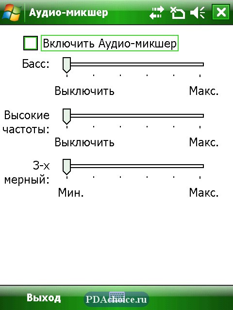 Мультимедиа Gigabyte i350Как я уже упоминал, динамик для разговоров громкий. Та же радужная ситуация и с внешним динамиком. Не стоит из-за него переживать. Вот чем может выделиться Glofiish X500+ по сравнению с Gigabyte, так это наличием радио. В Gsmart i350 оно не предусмотрено. Что интересно, в Gigabyte i350 есть возможность настроить звучание по своему вкусу, для чего есть «Аудио-микшер», в котором даже есть эффект 3х-мерного звучания.