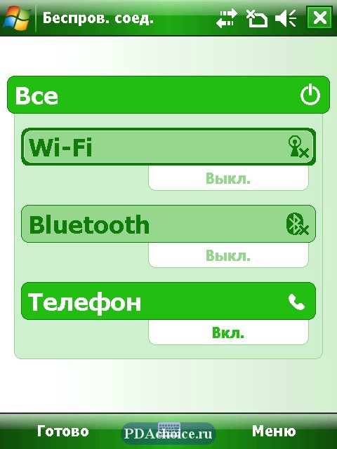 За включение/выключение беспроводных модулей связи (GSM/Bluetooth/WiFi) отвечает программа «Беспроводные соединения». В ней можно активировать или дезактивировать эти модули в одно касание экрана.