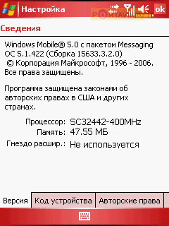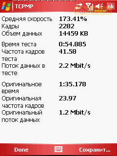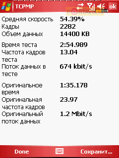 Хотелось бы также поговорить о стабильности функционирования коммуникатора при одновременной работе нескольких приложений. При запущенном приложении GPS-навигации (тестировали с Pocket GPS Pro Moscow и iGo), ICQ-пейджера и MP3-плеера, аппарат не «тормозил», но переключение между этими программами занимало некоторое время. Единственное нарекание по производительности относится к проигрыванию «тяжелого» видео-файла: 54% в тестировании плеером TCPMP — просто никчемный результат для такого аппарата.