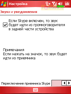 В настройках звуковых оповещений была обнаружена опция, при использовании которой, звук из программы Skype мог выдаваться как динамиком для разговоров, так и внешним динамиком (в зависимости от настройки). Напомним, что раньше такой возможности не было, и она появилась в пакете обновлений AKU 3.2. Конечно же, мы проверили данную функцию. Все работало корректно, за исключением того, что русский шрифт в программе Skype не распознавался и был заменен знаками вопроса.