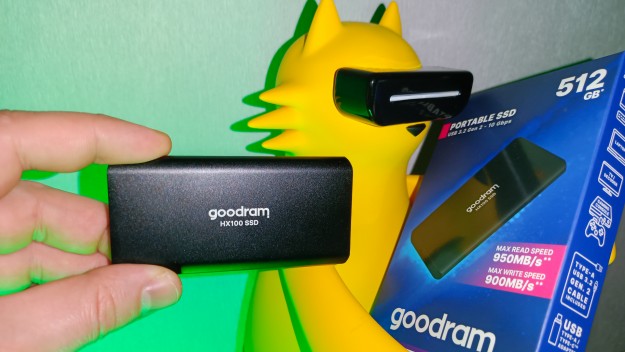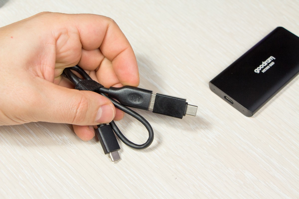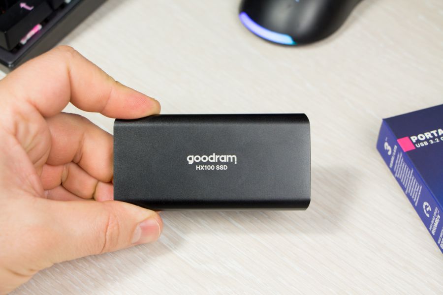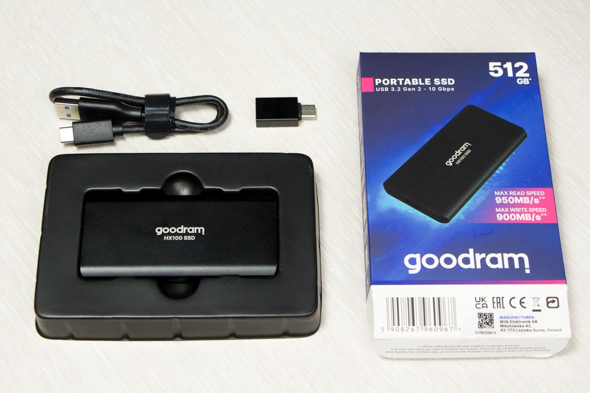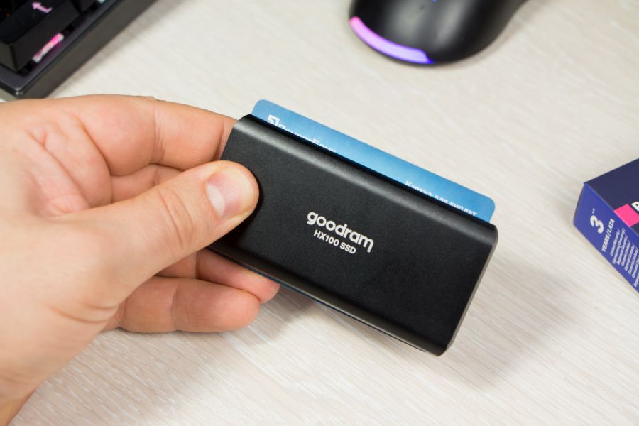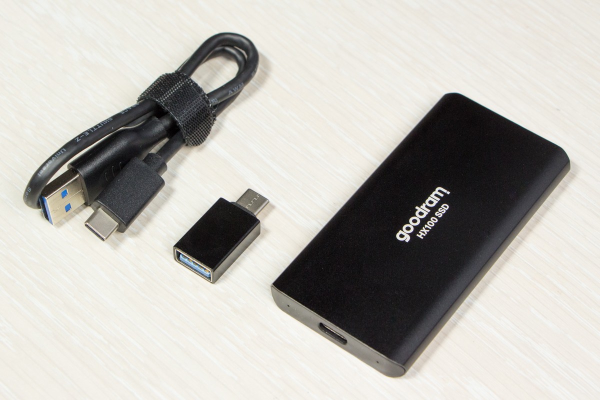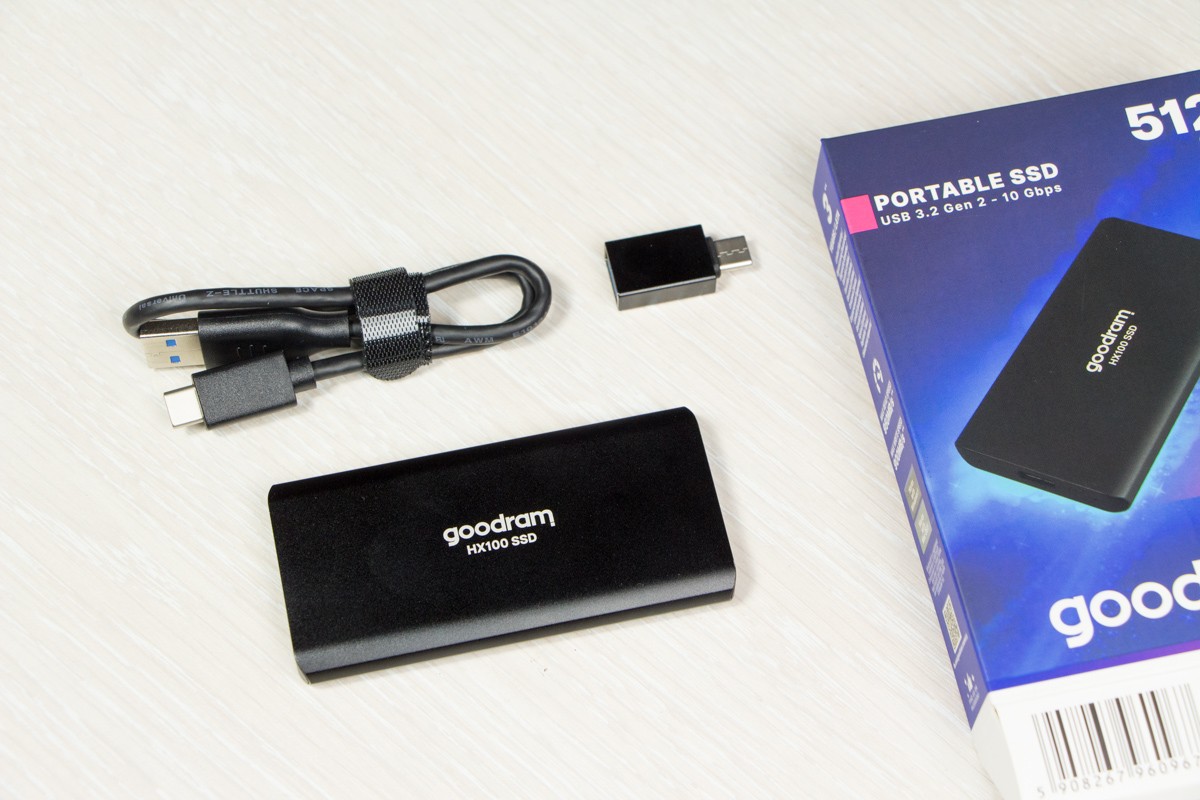 Обзор Goodram HX100: сверхбыстрый внешний SSD накопительGoodram HX100 можно уже в самом начале статьи назвать мечтой любого создателя контента. Хотя на практике диск подходит и тем, кто создает контент и требует его переноса между устройствами или локациями, и геймерам для расширения памяти приставок, и даже для обычного хранения данных к которым нужно иногда быстро получить доступ. Для начала пара цифр – скорость записи до 900 МБ/с, скорость чтения – до 950 МБ/с. Подробности по части характеристик и впечатления от диска узнаете из обзора. Комплект поставки Goodram HX100 попадает к владельцу в картонной коробке, на которой уже производитель указал важные характеристики накопителя и форматы его применения. Внутри упаковки диск, помещенный в пластиковую форму, кабель USB Type-C- USB Type-A и переходник с разъемом Type-A на Type-C. Длина кабеля около 30 см, чего достаточно для большинства случаев. Дизайн и Корпус Твердотельный накопитель Goodram HX100 – это небольшой по габаритам и легкий диск, который сверху, снизу и на двух боках упакован в металл. Цвет корпуса черный. Сборка без нюансов. Габариты корпуса 92х46х9.2 мм, Вес 40 г. По ширине диск немного уже кредитки, а по длине на пару миллиметров длиннее. Диск, при необходимости, можно носить даже в кошельке, если он у вас не из самых мелких. Со стороны подключения кабеля и противоположной от нее – пластик. Панели вставлены очень точно, без лишних зазоров. За одной из панелей скрыты болты, которые позволят вынуть чип с памятью. По обе стороны от USB Type-C разъема два небольших диода. Они загораются при обмене данными с накопителем. Основные характеристики Goodram HX100