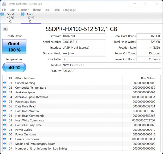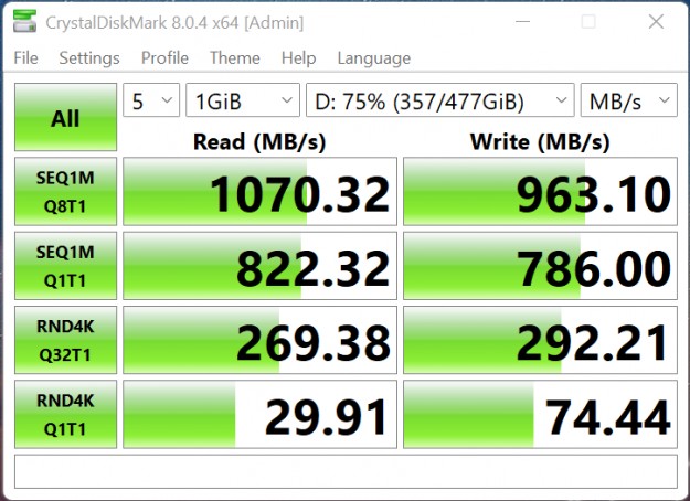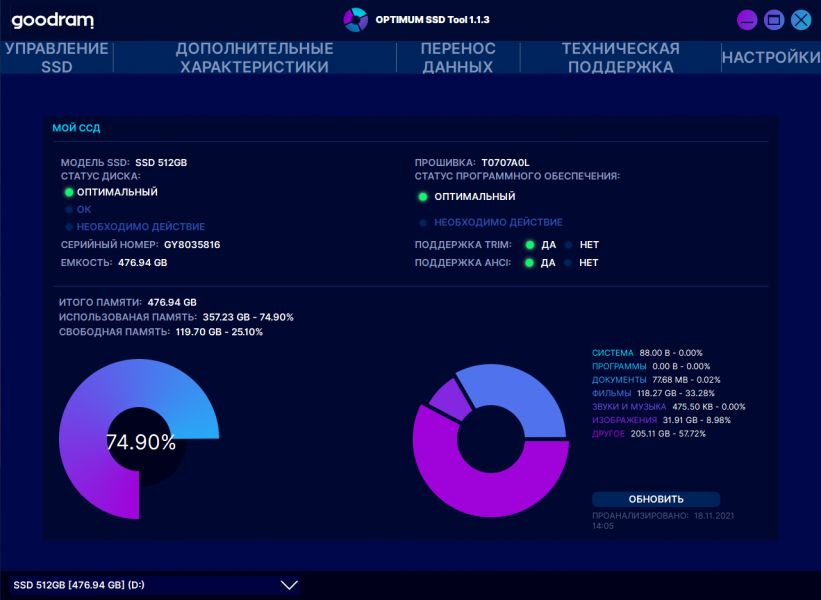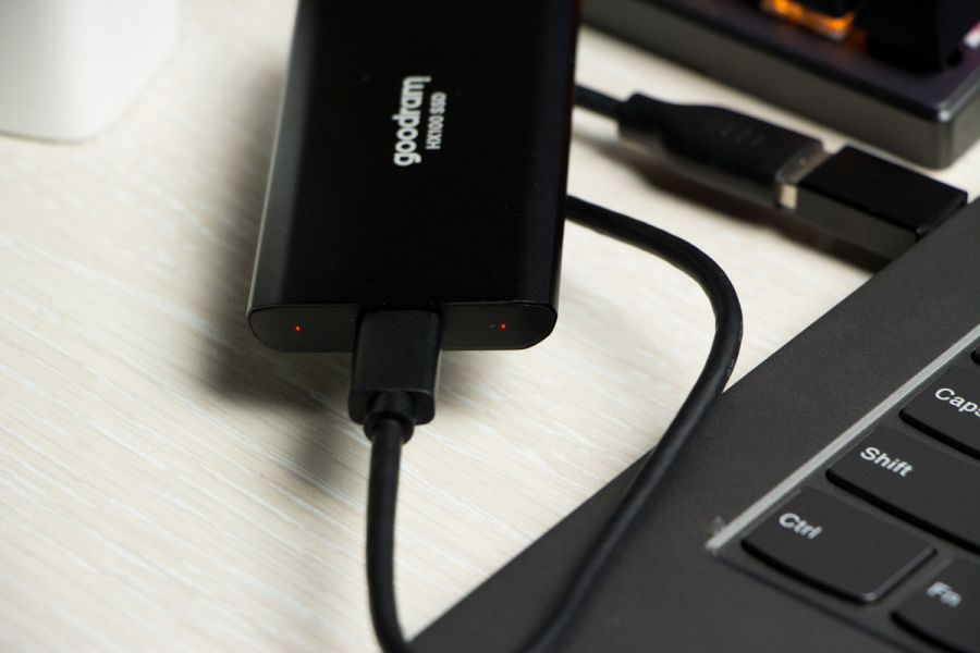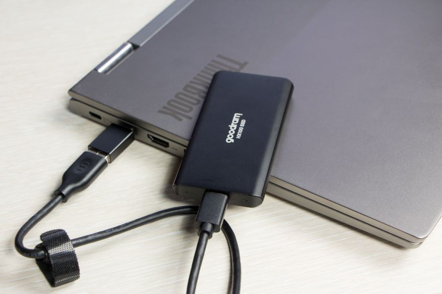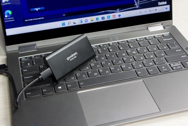 Возможности Goodram HX100 - твердотельный накопитель, который обеспечивает высокую скорость передачи файлов и бесшумную работу. При этом не важно, работаете вы под Windows, macOS или подключились к игровой приставке. Распознается диск за пару секунд. Максимальные скорости чтения и записи, которые может получить владелец - 950 МБ/с и 900 МБ/с соответственно. Однако помните, что железо, к которому подключаетесь, также должно поддерживать самые актуальные способы подключения для достижения заявленных скоростей. Скоростные характеристики проверили на ноутбуке Lenovo ThinkBook 14s Yoga у которого: