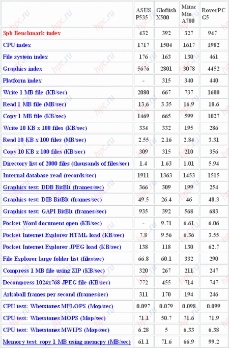 Быстродействие и памятьRoverPC G5 оборудован лучшим на сегодня процессором для мобильных устройств - Intel XScale PXA 272 с тактовой частотой 520 МГц. Собственно, мы неоднократно рассказывали об этом процессоре, но повторимся еще раз. Этот процессор обеспечивает высокую производительность при экономном энергопотреблении. Тесты на быстродействие RoverPC G5 только лишний раз подтверждают это. Предлагаем вашему вниманию результаты, которые продемонстрировал Spb Benchmark. Что характерно, на этом аппарате тест прошел практически без сбоев и без проблем.