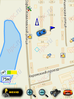 Изменим масштаб и посмотрим на карту поближе, с условным масштабом в 75 м. В таком приближении становятся видны дома и прочие подробности. Довольно быстро на экране появляется синенькая машинка, с ювелирной точностью указывающая где мы находимся. Браво, GPS!