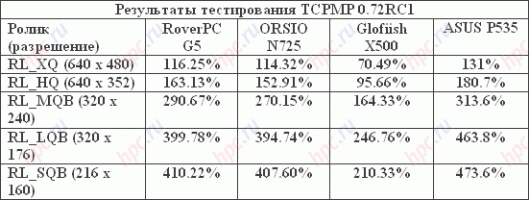 А теперь проверим быстродействие RoverPC G5 с помощью плеера TCPMP. Тестовые ролики для плеера, сжатые кодеками DivX и XviD в самых популярных разрешениях, свободно распространяются на сайте разработчиков этой программы. Напомним, что согласно общепринятой методике, нормальной скоростью воспроизведения ролика считается показатель в 100%, но поскольку TCPMP отображает усредненный результат, за норму принято брать 120%. Безусловно, чем больше результат, тем лучше. В таблице чуть ниже представлены достижения подопытного в сравнении с аналогичными устройствами.