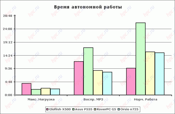 Время автономной работыВ активе у RoverPC G5 - довольно емкая батарея на 1530 мАч. Давайте посмотрим, сколько она продержится в наших стандартных тестах. 1. Режим максимальной нагрузки. Яркость подсветки выставлена на максимум, громкость динамика - тоже, включен Wi-Fi в режиме поиска сети и Bluetooth, через Windows Media Player в цикле воспроизводится "тяжелый" видеоролик. Время автономной работы в этом режиме составило – 2 часа 25 минут. 2. Нормальная работа. Все беспроводные модули отключены. Яркость подсветки установлена на второе по счету деление (т.е. средний уровень). На коммуникаторе была запущено чтение текста в программе Haali Reader с автоматической прокруткой. Время работы составило – 15 часов 40 минут. 3. Воспроизведение МР3. Wi-Fi, Bluetooth и экран выключены. Прослушивание через наушники на максимальной громкости. Использовался Pocket Media Player и файлы с битрейтом 192 Кб/c. Время работы – 8 часов 50 минут. RoverPC G5, на мой взгляд, показал оптимальные результаты, учитывая установленный в нем высокопроизводительный процессор. Особенно долго аппарат продержался в режиме чтения. Правда, до лидера Asus P535 ему все же далековато, как и большинству коммуникаторов.