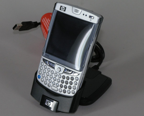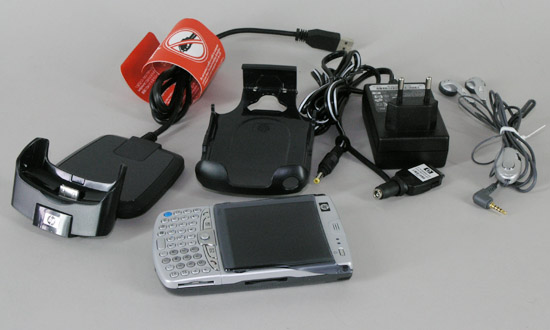 Далее пластиковый отсек с четырьмя углублениями в которых и находится непосредственно комплект поставки. Сам коммуникатор, аккумулятор, стандартный кредл HP , некое подобие чехла из пластика с защёлкой на пояс, закрывающего только половину устройства и проводная гарнитура с регулятором громкости, что приятно удивило. Блок питания, он же зарядное устройство заслуживает отдельного внимания. «Хвост» зарядного устройства ответную часть имеет только в кредле КПК, для зарядки аккумулятора без кредла в комплект входит переходник на стандартный разъём интерфейсный HP.