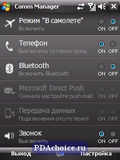 Коммуникации HTC P3470 PharosМодель HTC P3470 работает в сетях GSM (850/900/1800/1900) и обладает поддержкой EDGE. Из беспроводных интерфейсов в аппарате есть только Bluetooth, что выглядит странно, если проводить параллели с P3300. Отчего в компании решили отказаться от Wi-Fi? Видимо по причине непопулярности интерфейса, ведь пользуется им очень небольшое число людей, купивших устройство. С другой стороны, лишение новой модели модуля Wi-Fi никак не сказалось на стоимости, она не стала ниже, чем в новых моделях с Wi-Fi от других производителей. Для работы с интерфейсами используется фирменная программа HTC, она позволяет включить один из модулей или все сразу (GSM, Bluetooth), а также перейти к настройкам каждого из модулей связи.