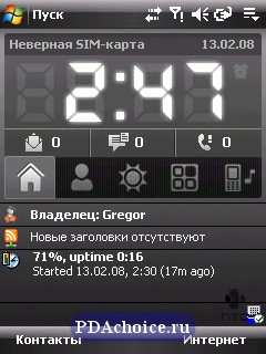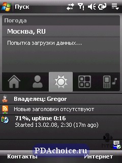 Следующим крупным пунктом и отличием от P3300 идет устанавливаемая до этого момента только в модели Touch-серии программа. HTC Home – это оболочка, расположенная на экране «Сегодня». В ней есть пять вкладок: время, погода, быстрый доступ к контактам, программы и профили. В первой вкладке, где отображено время, также есть доступ к сообщениям почты, текстовым сообщениям и MMS. В кладке с погодой можно выбрать простой режим, когда показана погода на текущий день с большой иконкой, или подробный режим, в котором отображается погода на 5 дней вперед. Вкладка Контакты отображает миникартинки или имена для 9 контактов. Их можно вызвать простым нажатием на картинку абонента. Во вкладке программ можно выбрать 9 приложений, которые будут отображены здесь. Наконец в последней вкладке расположены кнопки смены профилей: звук, вибровызов, беззвучный и автоматический (изменяется по данным календаря, текущим встречам и событиям).