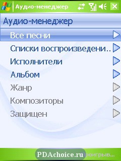 Среди настроек можно найти небольшое приложение, в котором можно задать параметры блокировки устройства. А так же есть очень полезная фирменная (!) утилита «Диспетчер задач», которая позволяет назначить «закрытие», а не «сворачивание» при нажатии на «крестик» в углу активного окна. Напомню, что изначально в Windows Mobile 5.0 нажатие на «крестик» не закрывает приложение, и не выгружает его из памяти. Для того, чтобы организовать свою музыкальную коллекцию в HTC P4350 Herald присутствует программа «Аудио-менеджер». Она позволяет быстро отсортировать нужные файлы по имени исполнителя, названию альбома и так далее. Так же в ней есть возможность создавать плей-листы. Программа не слишком функциональная, но для начала сойдет.