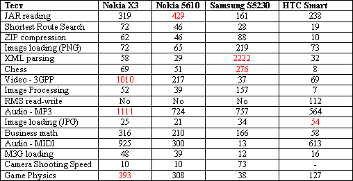 Сердце телефона - процессор Qualcomm MSM 6290, работающий с тактовой частотой 300 МГц. Память: 256 МБ оперативной и 256 МБ постоянной. Быстродействия вполне достаточно для работы с оболочкой Sense. «Тормоза» начинают проявляться в меню настроек, а также при просмотре видео. Даже при разрешении в 320 х 240 ролики идут явно с недостаточным количеством кадров. Таблица 1. Результаты теста JBenchmark Pro
