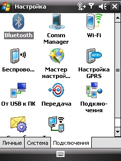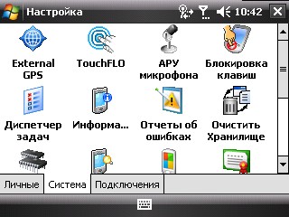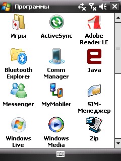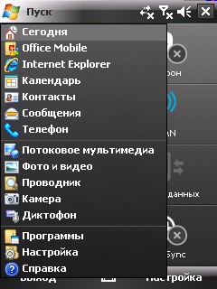 Задняя крышка снимается полностью. Под ней установлен аккумулятор. SIM-карта и карта памяти устанавливаются в специальные разъемы, спрятанные под серебристой гранью левого торца. Они не портят вид корпуса лишними деталями, удобно достаются и устанавливаются. Мультимедийный динамик виднеется на тыльной стороне. Он очень громкий и позволит услышать звонок, даже если коммуникатор будет лежать на столе в шумной комнате. Качество воспроизводимого звука очень высокое. Антенна занимает верхнюю грань тыльной части корпуса. Это идеальное место для данного элемента конструкции. Периферийные устройства подключаются к HTC Touch через специальный ExtUSB-разъем. Последний установлен на нижнем торце рядом с отверстием Soft Reset и креплением для шнурка. Это один из немногих Windows-коммуникаторов (если не единственный), который действительно можно повесить на шею, и он не будет тянуть пользователя к земле непомерным весом. ФункционалПрограммно HTC Touch построен на базе недавно представленной Windows Mobile 6 Professional. Стандартная комплектация дополнена уникальным интерфейсом TouchFLO (вызывается вертикальным скольжением пальца по экрану и позволяет запускать многие необходимые функции одним движением), а также множеством других программ. Начнем с новой операционной системы WM6. Она отличается от предыдущей версии оформлением интерфейса и доработкой некоторых приложений. Ничего концептуально нового нам заметить не удалось.