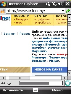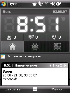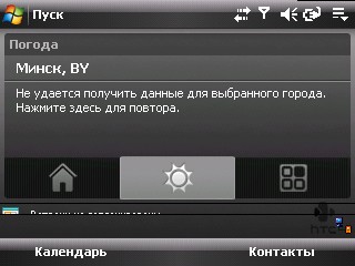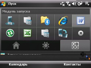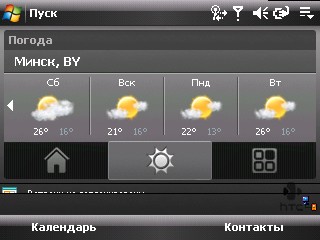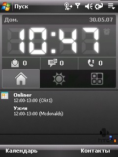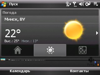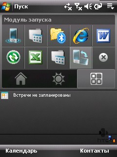 Вместо привычного Active Standby установлена удобная оболочка, являющаяся частью TouchFLO. Она состоит из трех страниц. На первой видны часы, дата, информация о запланированных событиях, звонках и сообщениях, на второй — обновляющийся через интернет прогноз погоды, на третьей — настраиваемый список из 10 программ. TouchFLO анонсировалась как средство, позволяющее забыть о стилусе и управлять девайсом только пальцами. В действительности оболочка используется для запуска стандартных приложений Windows Mobile, которыми сложно управлять без стилуса, особенно если требуется ввод с клавиатуры. Полностью отказаться от пера она не позволит, но некоторым покажется значительно удобнее стандартного интерфейса WM6. Из негативных моментов — путаница, которая возникает из-за дублирования одних и тех же программ в двух-трех местах: в стандартном меню, в оболочке на десктопе и на гранях всплывающей призмы. Еще один положительный момент HTC Touch — возможность прокрутки в стиле iPhone, когда вместо горизонтального или вертикального скролла можно воспользоваться характерным движением пальца. Это очень удобно.