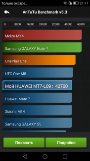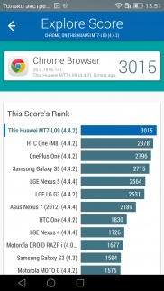 Аппаратная платформа тестируемого смартфона построена на базе процессора Hisilicon Kirin 925 (4-ядра Cortex-A15 с частотой 1.8 ГГц, 4-ядра Cortex-A7 с частотой 1.3 ГГц) плюс графика Mali-T628 MP4 ( 6 ядер по 600 МГц). Помимо этого внутри предусмотрен отдельный чип для обработки информации с датчика отпечатков пальцев и других сенсоров. Кстати, именно благодаря ему встроенный шагомер не убивает батарею за полдня.