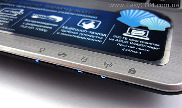 На фронтальной стороне расположен лишь блок индикаторов, который отображает активность подключения к сети, состояние заряда аккумулятора, активность обращения к жесткому диску, активность беспроводной сети Wi-Fi, а также активность клавиши Caps Lock. Пояснительные пиктограммы можно увидеть только в раскрытом состоянии нетбука.