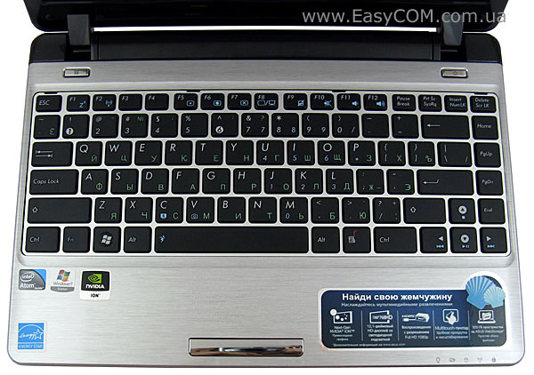 Полноразмерная chiclet-клавиатура, установленная в нетбуке ASUS Eee PC 1201PN, обеспечивает высокий уровень комфорта во время работы. Клавиши достаточно крупные и имеют плоскую немного шершавую поверхность, обеспечивающую хороший контакт с пальцами. Благодаря мягкому и тихому ходу с хорошим откликом они отлично чувствуются во время работы. Нанесение символов на клавиши очень удачное. Латиница имеет крупный шрифт, окрашенный белым цветом. Кириллица обозначена немного меньшим шрифтом бирюзового цвета. Функциональные символы имеют наименьшие размеры и выделены голубым цветом.