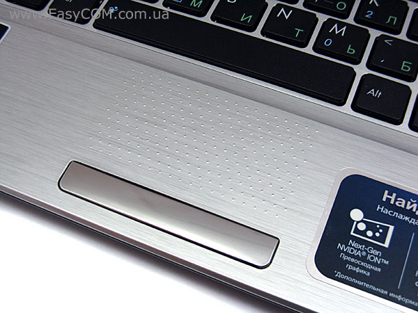 Тачпад, из-за отсутствия бортиков, ограничивающих чувствительную область, несколько неудобный, т.к. достаточно часто теряются его пределы. Чтобы их не потерять полностью, производитель покрыл всю площадь маленькими пупырышками, которые хоть и улучшают скольжение пальца, но и вызывают некий дискомфорт, особенно учитывая недостаточно высокую чувствительность панели. Общее впечатление исправляет лишь реализованная поддержка «мультинажатий», которые обеспечивают быстрый доступ к вертикальной и горизонтальной прокрутке, зуммированию, вращению и быстрой перемотке страниц. Клавиши, расположенные под тачпадом и выполненные из единой полированной металлической пластины, имеют хороший ход и отклик на нажатия. Акустика