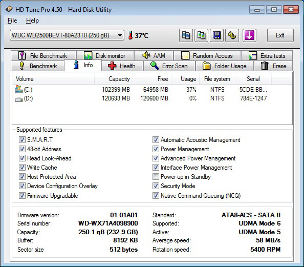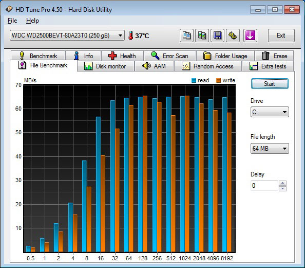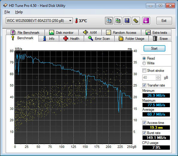 «Хроники Риддика» (Качество:HDTV. Видео: VC-1, 16 Мбит/с 1920x1080. Аудио: Русский (Dolby AC3, 6ch, 448 Кбит/с, 48 КГц), Английский (Dolby AC3, 6ch, 448 Кбит/с, 48 КГц)) Как видно по уровню загрузки процессора, для next-gen NVIDIA ION немного проблематично оказалось воспроизведение только фильма «Хроники Риддика», который кроме достаточно большого видеопотока (16 Мбит/с) еще и закодирован с помощью наиболее сложного для воспроизведения кодека VC-1. С декодирование остальных фильмов и, возможно, даже с фильмами в VC-1, но с меньшим видеопотоком, нетбук справится, что позволит владельцу насладиться и HD-Video. Накопители При помощи программы HD-Tune мы получили полную характеристику дисковой подсистемы нетбука, которая основывается на жестком диске WDC WD2500BEVT-80A23T0 емкостью 250 ГБ и со скоростью вращения шпинделя 5400 об/мин.