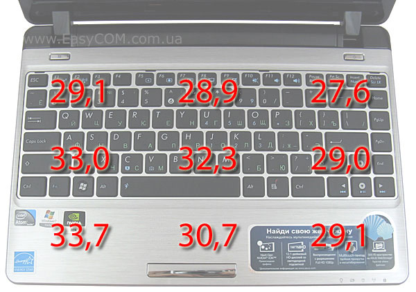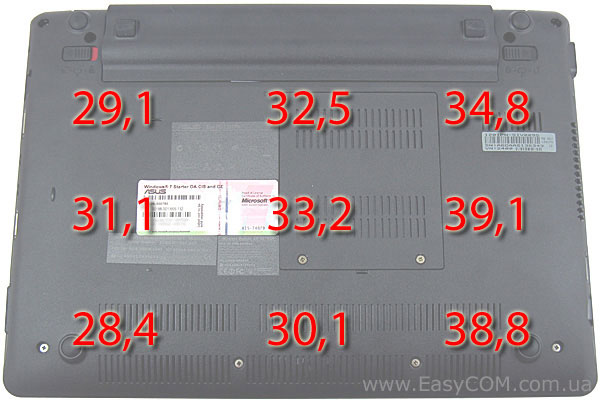 В режиме простоя шум системы охлаждения практически отсутствует, но стоит только запустить весьма требовательное приложение, так сразу же звук от работы установленного вентилятора начинает проявляться. Хотя, в целом, он и не такой громкий, что стояло бы начинать переживать. Для измерения температурного режима во время работы, мы, воспользовавшись Scythe Kama Thermo Wireless, образно поделили на девять участков рабочую зону и днище нетбука. Температура окружающей среды во время измерений составляла +29 °C. В результате измерений мы определили, что нетбук остается не очень горячим даже во время высокой нагрузки. Так, наибольшее значение составило 39,1 градуса. Автономная работа Для определения времени автономной работы нетбука мы использовали программу Battery Eater, которая позволяет производить замеры в нескольких режимах: